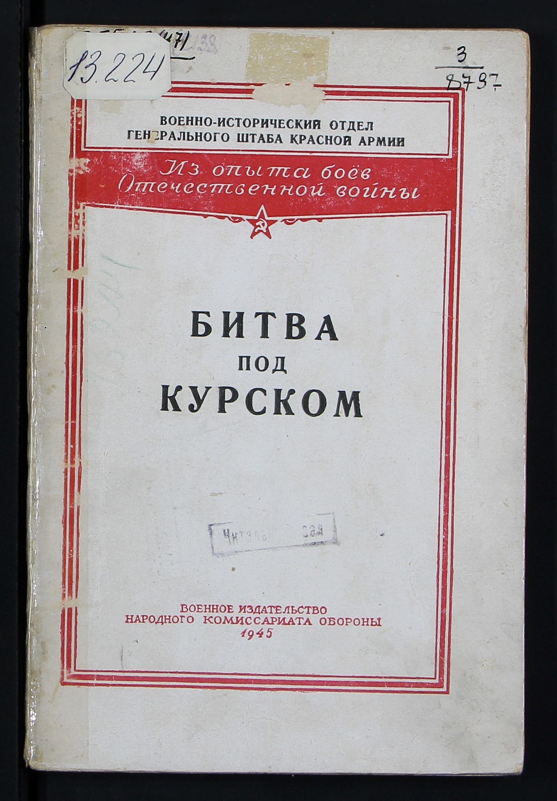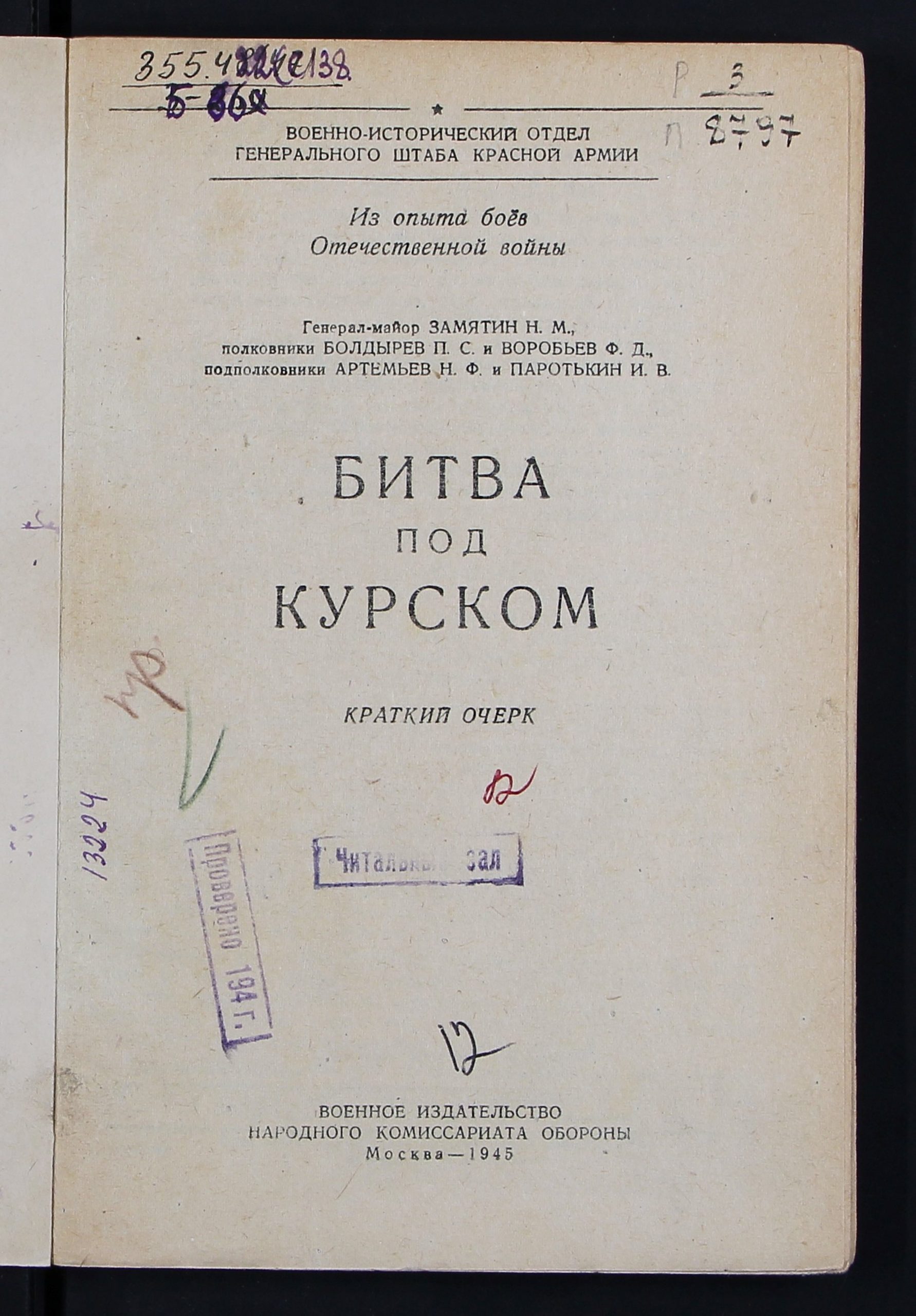 Битва под Курском : краткий очерк / Н. М. Замятин [и др.] ;/ Военно-исторический отдел Генерального штаба Красной армии. – Москва : Военное издательство Народного комиссариата обороны, 1945. – 95, [2] с., [2] л. карт. – (Из опыта боев Отечественной войны).