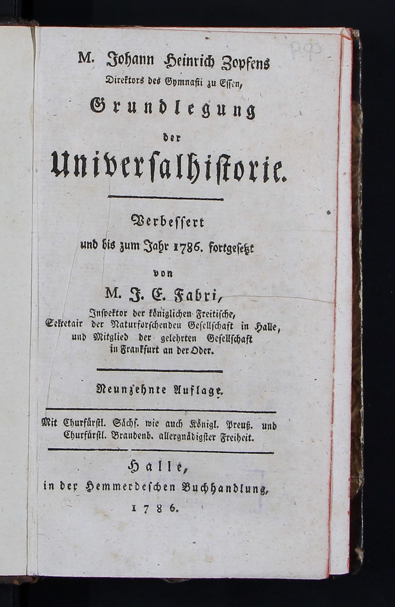 Zopf, J. H. M. Johann Heinrich Zopfens Grundlegung der Universalhistorie / verbessert und bis zum Jahr 1786. fortgesetzt von M. J. E. Fabri. – 19. Aufl. – Halle : in der Hemmerdeschen Buchhandlung, 1786. – [36], 427, [53] с., [1] л. табл.