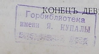 Штамп прямоугольный, 16х36, шрифтовой, с текстом в линейной рамке (два слова неразборчиво): «Горбиблиотека | имени Я. Купалы | …».